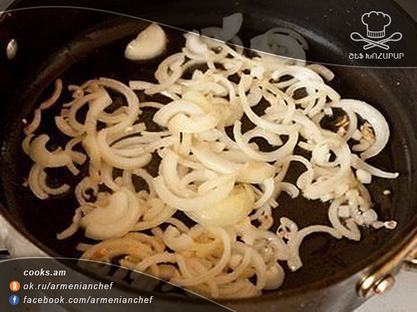 - Սոխն ու սխտորը 4-5 րոպե տապակում ենք (այն թավայում, որում տապակել էինք ֆիլեն)։