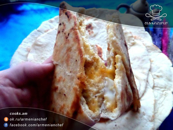 - Լավաշը եռանկյունաձև ծալում ենք, թավայի մեջ կարագ հալեցնում և կարկանդակը կարը դեպի ներքև դնում թավայի մեջ: