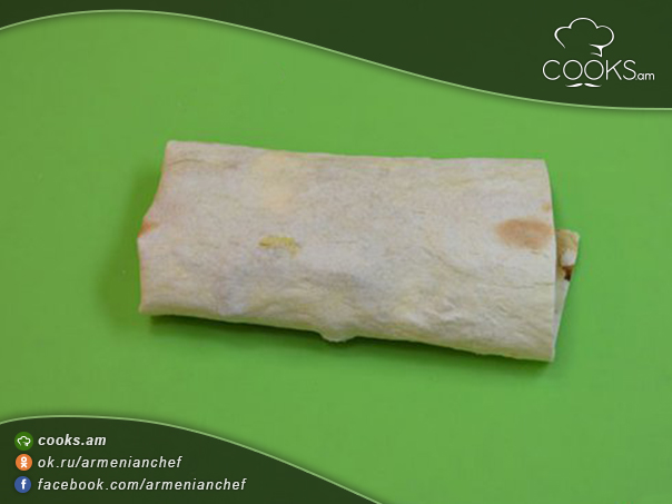 - Լավաշը կտրում ենք, մեջտեղը դնում հավի կրծքամիսն ու մարինացված սոխը, վրան լցնում մայոնեզը, վարունգը, գազարն ու կաղամբը: