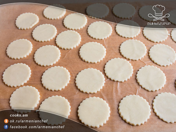 - Խմորը 2 մասի ենք կիսում։ Խմորի մի կեսը յուղաթղթի վրա 3մմ հաստությամբ շերտով գրտնակում ենք և շրջաններ ենք կտրում: