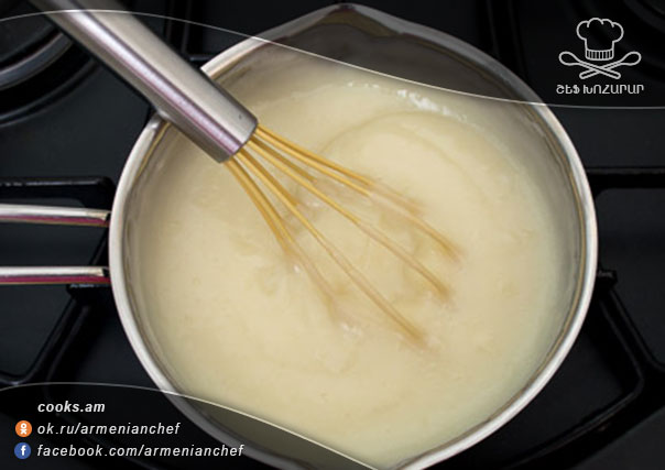 - Միջին ուժեղության կրակի վրա անընդհատ խառնելով եփում ենք, մինչև լավ թանձրանա։ Պատրաստի կրեմը ամբողջությամբ սառեցնում ենք։