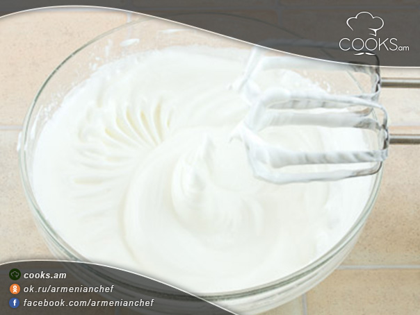 - Պատրաստում ենք մերենգան, որի համար սպիտակուցները հարում ենք այնքան, մինչև ստացվի պինդ զանգված։ Հարելու ընթացքում աստիճանաբար ավելացնում ենք շաքարի փոշին ու վանիլային շաքարը։ Շարունակելով հարելն՝ ավելացնում ենք օսլան։