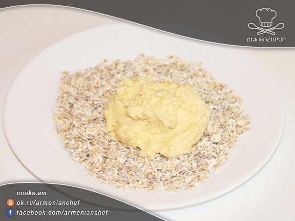 - Կաթնաշոռից ձեռքերով կլոր պանրիկներ ենք ձևավորում և վարսակի փաթիլների մեջ թաթախում։