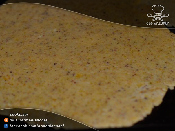 - Այնուհետև խմորը 2 մասի ենք կիսում, շերտերը դնում ենք սննդային թաղանթների արանքում և բարակ գրտնակում ենք, այնուհետև զգուշորեն տապակի մեջ տեղափոխում։ Անհրաժեշտ չափի շրջաններ ենք կտրում և տապակը 20 րոպեով տեղափոխում ենք սառնարանը, այնուհետև շերտերը մոտ 15 րոպե թխում ենք։ Պետք է զգույշ լինենք, քանի որ շերտերը շատ փխրուն են։