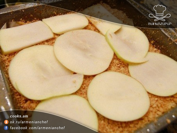 - Այնուհետև վրան ենք շարում խնձորի կեսը։ Վրան կրկին ընկույզ ենք ցանում և 4 հատ կարագապատ շերտ ենք դնում։