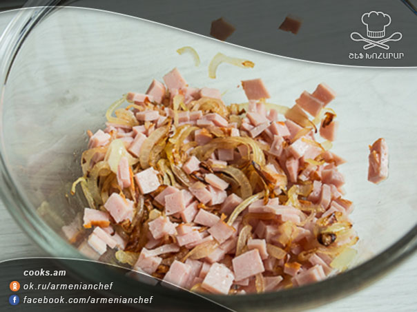 - Սոխը կիսաշրջաններով կտրատում ենք և միջին ուժեղության կրակի վրա մոտ 5-6 րոպե տապակում ենք մինչև ոսկեգույն երանգ ստանանք։