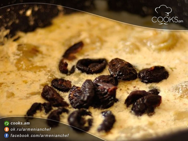 - Այնուհետև սոուսի մեջ լցնում ենք սոխերն ու կորիզահան արած սալորաչրերը, աղ ու պղպեղ ենք ցանում և եռացնում 5 րոպե: