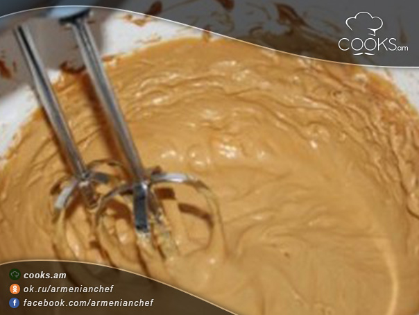 - Փափկած կարագը հարում ենք, ապա ավելացնում ենք եփած խտացրած կաթը և շարունակում ենք հարել։