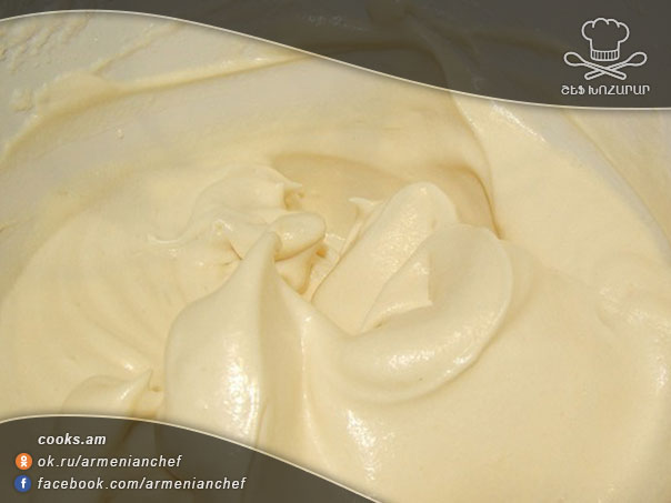 - Եվս մեկ րոպե հարում ենք։ Գդալով սպիտակուցները պատերից ներս ենք բերում, որպեսզի օշարակը հավասարապես տարածվի։ Այնուհետև հարիչի արագությունն իջեցնում ենք և ավելացնում ենք կաթնաշոռային զանգվածը։ Այդ ամենը լավ խառնում ենք մինչև համասեռ դառնա։