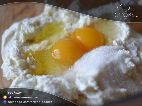 - Կաթնաշոռը լցնում ենք տարայի մեջ, ավելացնում ենք ձուն, աղն ու շաքարավազը։