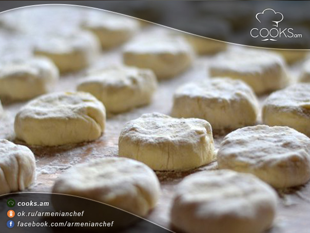 - Խմորներից ստանում ենք երկու երկար խմորներ ու բաժանում ենք հավասար կտորների։