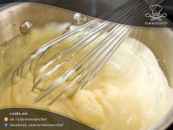Եթե կաթն արդեն եռում է, ապա կրակից վերցնում ենք և լցնում դեղնուցներով լի զանգվածի մեջ: Պետք է համասեռ, սպիտակ և ջրիկ զանգված ստանանք, որը դեռևս կրեմի թանձրության չէ:
