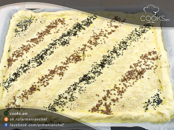 - Պատում ենք ձվով և ցանկության դեպքում զարդարում ենք քունջութով, կակաչի կամ արևածաղկի սերմերով։