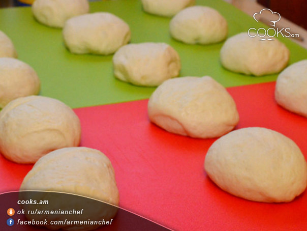 - Խմորը բաժանում ենք մոտ 16 փոքր մասերի ու վերածում գնդերի:
