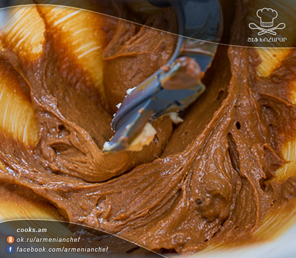 - Կարագը շաքարավազի հետ հարում ենք այնքան մինչև կրեմանման զանգված ստանանք։ Ավելացնում ենք խտացրած կաթը և նորից խառնում։