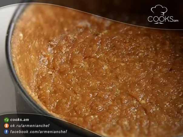 - Թխվածքաբլիթներն ու ընկույզները բլենդերով փշրանքի ենք վերածում: Կարագը հալեցնում ենք, լցնում զանգվածի մեջ և լավ խառնում: