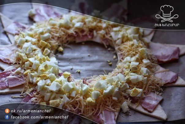 Հուսով ենք կհավանեք բեկոնի և պանրի միջուկով այս կարկանդակը պսակի տեսքով: Այն շատ գեղեցիկ և տպավորիչ է նայվում սեղանի վրա իր յուրօրինակ տեսքի շնորհիվ: