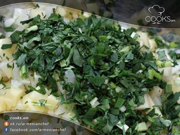 - Ավելացնում ենք մանր կտրատած կանաչին ու համեմում ենք աղով։