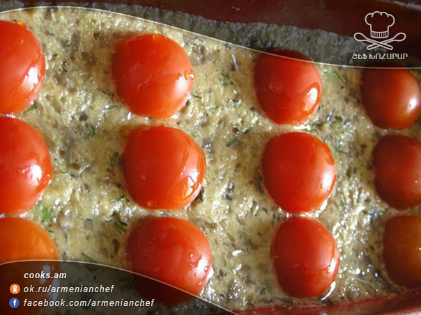 - Վրայից շարում ենք լոլիկի կեսերը (կարող ենք ամբողջ մակերեսը չերրի լոլիկի կեսերով ծածկել` ըստ ցանկության)։