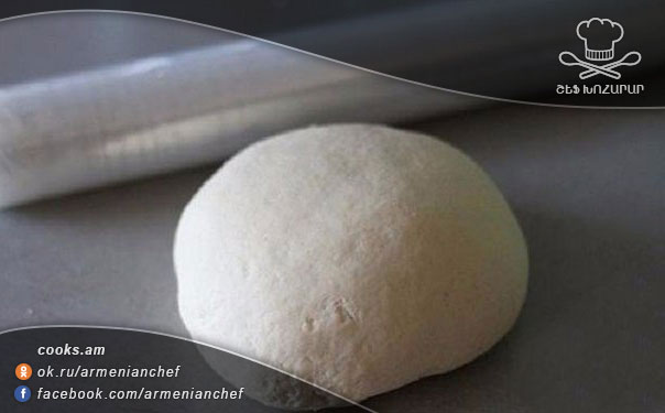 - Խառնում ենք ալյուրն ու քերիչով անցկացրած կարագը, վրան ավելցնում աղը: Կեֆիրի մեջ լցնում ենք սոդան և երբ այն սկսում է փրփրել ավելացնում ենք ալյուրային զանգվածին, խառնում ենք և հունցում փափուկ ոչ կպչուն խմոր: Պատրաստի խմորի վրա անցկացնում ենք ցելոֆան և թողնում հանգստանա 20 րոպե: