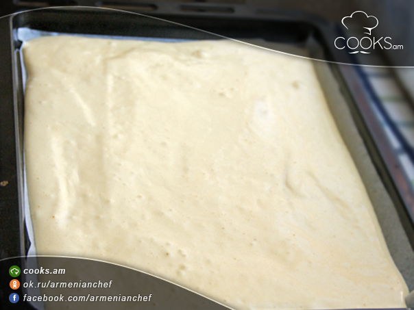 - Խմորը լցնում ենք տապակի վրա ու հարթեցնում: