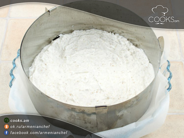 - Ձևամանը պատում ենք յուղաթղթով, ապա զանգվածի մի մասը լցնում ենք ու 10 րոպե թողնում սառնարանում, որից հետո լցնում ենք մյուս մասն ու դնում սառնարանի մեջ, որպեսզի ամբողջովին սառչի։