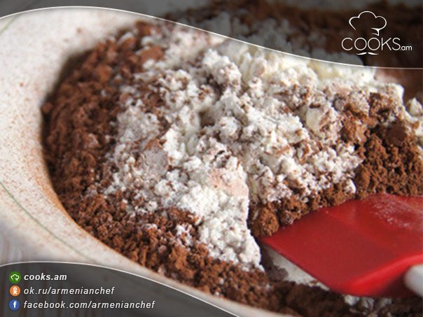 - Ամանի մեջ խառնում ենք մաղած ալյուրը, կակաոն, փխրեցուցիչը և աղը: