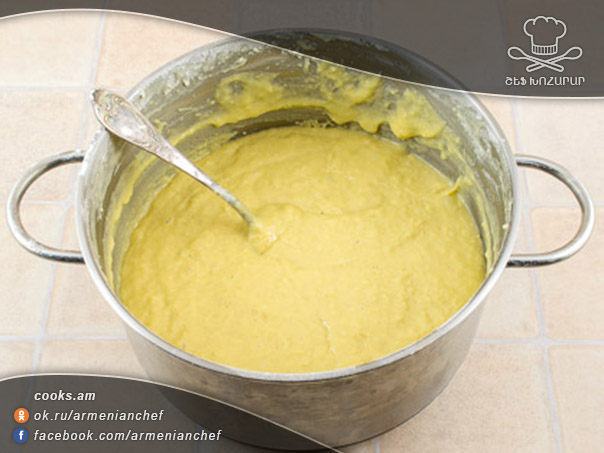 - Ավելացնում ենք 500 գր ալյուրը և գդալով լավ խառնում ենք։