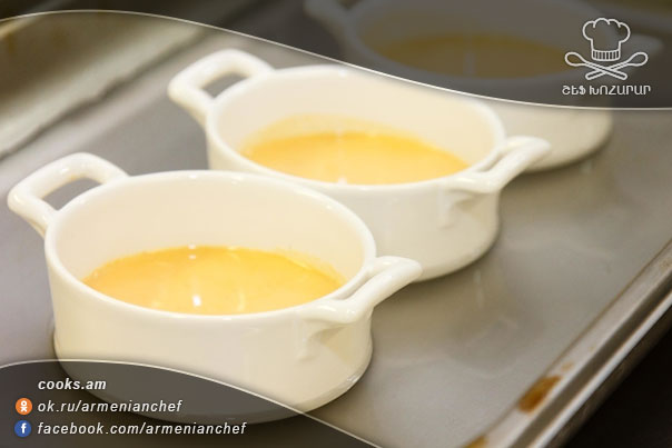 - Դնում ենք ձևամանները ջրով լցված տապակի մեջ ու դնում ջեռոցը 40 րոպեով 100 աստիճանում: