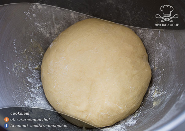- Աստիճանաբար ալյուր ենք ավելացնում և ձեռքերին չկպչող փափուկ խմոր հունցում։ Այնուհետև գնդում ենք և դնում տարայի մեջ։