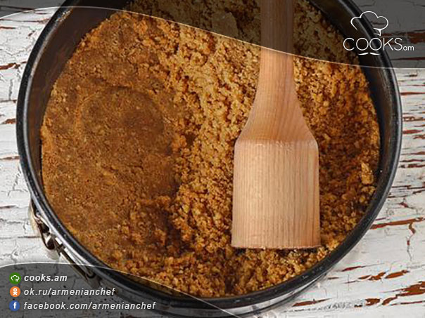 - Ջրի մեջ լցնում ենք ժելատինն ու թողնում 20 րոպե, որ ուռչի: Թխվածքաբլիթներն ու կարագը լցնում ենք բլենդերի մեջ և մանրացնում: Հիմքը լցնում ենք յուղաթղթապատ ձևամանի մեջ և տարածում: