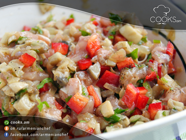 - Կտրատած միսը, շամպինիոնը, բուլղարական տաքդեղն ու մաղադանոսը լցնում ենք կաթսայի մեջ, աղ ու պղպեղ ցանում, ավելացնում մշկընկույզը և լավ խառնում ենք: