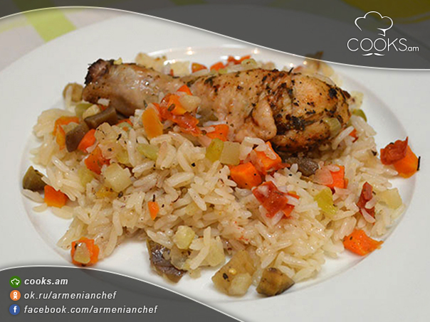- Սոխը մանր կտրատում ենք և ձիթայուղով տապակում: Բրինձն ու սոխը լցնում ենք ձևամանի մեջ, վրան աղ ենք ցանում և ջուր լցնում: