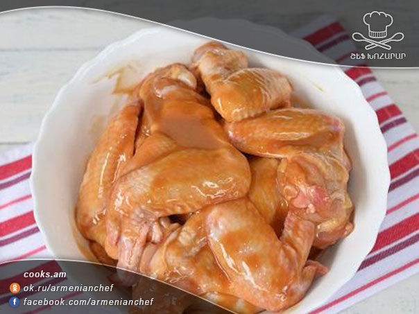 - Թևիկները լվանում ենք, դնում ամանի մեջ և վրան մարինադ լցնում։ Լավ խառնում ենք, որպեսզի թևիկներն ամբողջությամբ մարինադով ծածկվեն։ Ամանը կափարիչով ծածկում ենք և 12 ժամով (կամ առնվազն 2 ժամով) տեղափոխում ենք սառնարանը, որպեսզի թևիկները մարինացվեն։ Կարող ենք գիշերը սառնարանում թողնել։ Մարինացնելու ընթացքում թևիկները մի քանի անգամ խառնում ենք։