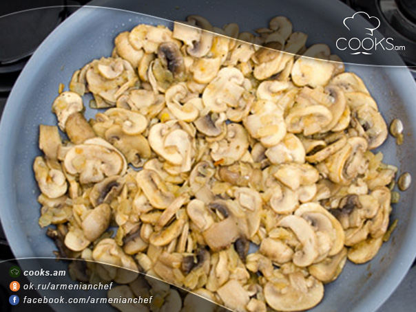 - Սունկը ևս կտրատում ենք ու լցնում տապակի մեջ։