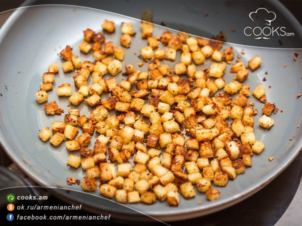 - Պատրաստում ենք համեմված չորահացերը: Սոուսի համար նախատեսված բաղադրիչները խառնում ենք, հացերը խորանարդաձև կտրատում և թաթախում սոուսի մեջ: Չորահացերը մի քանի րոպե տապակում ենք: