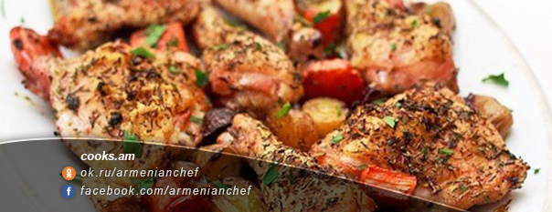 Բանջարեղեններով և համեմունքներով պատրաստված հավ ջեռոցում: