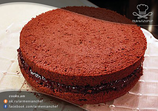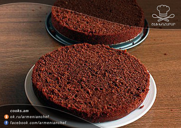 Բիսկվիթը շրջում ենք հակառակ երեսի վրա և յուղաթուղթը հանում ենք։ Բիսկվիթը 2 շերտի ենք բաժանում։
