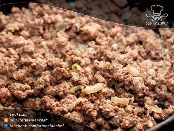 - Սոխը մանր կտրատում ենք և բուսայուղի մեջ տապակում մինչև կիսաթափանցիկ դառնա։