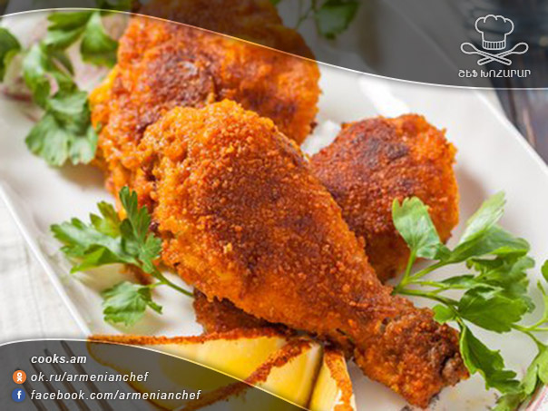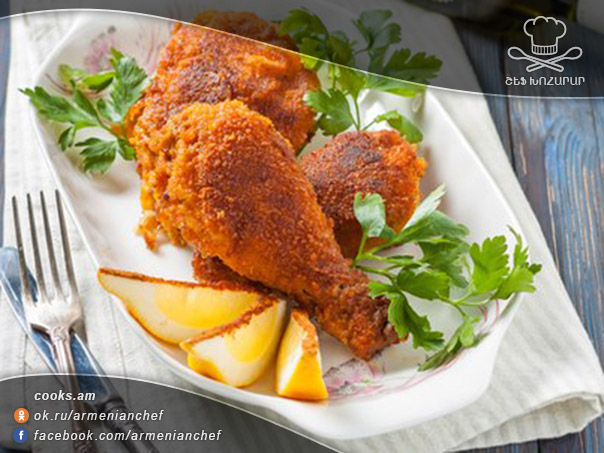 - Մեկ ամանի մեջ ենք լցնում ալյուրը, մյուսի մեջ` ձվերը, իսկ երրորդ ամանի մեջ` սպիտակ պաքսիմատը, որը կարող ենք խառնել պապրիկայի և քրքումի հետ` գույնի համար։ Ճուտի կտորները թաթախում ենք սկզբում ալյուրի, այնուհետև ձվի, որից հետո պաքսիմատի մեջ։