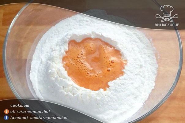 հասցնում ենք եռման աստիճանի, ալյուրի մեջ փորվածք ենք անում և լցնում ենք