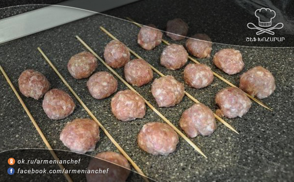 - Մինի խորոված հիշեցնող այս ուտեստը պատրաստելու համար կտրատում եք սոխը, լցնում աղացած մսի մեջ, ավելացնում սոյայի սոուսը, պղպեղը, ճզմած սխտորը, լավ խառնում և տեղափոխում սառնարան 30 րոպեով: Այնուհետև մսից ձևավորում ենք 20 հատ կոլոլակ: