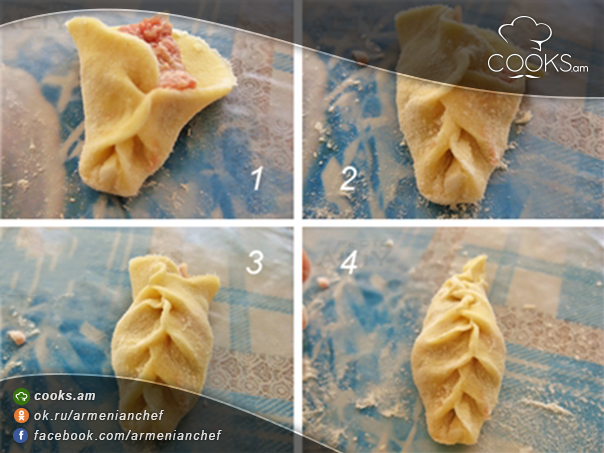 - Պատրաստում ենք խմորը: Բոլոր բաղադրիչները լավ հարում ենք, այնուհետև կամաց-կամաց ավելացնում ալյուրը: Պետք է փափուկ խմոր ստանանք: Թողնում ենք, որ խմորը 30 րոպե հանգստանա, ինչից հետո գրտնակում ենք և բաժակով շրջաններ կտրում:
