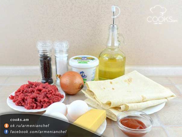 - Լավաշը դնում ենք սեղանին, վրան լցնում ենք ստացված մսային զանգվածը, ապա՝ պանիրը:
