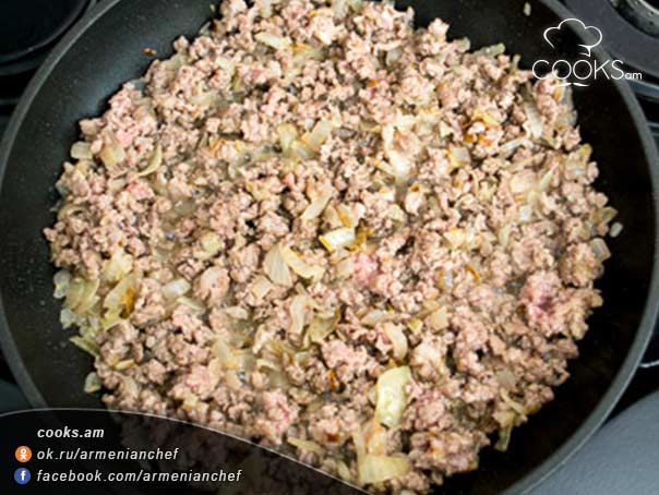 - Ավելացնում ենք աղացած միսը և տապակում ենք, որից հետո համեմում ենք աղով ու պղպեղով: