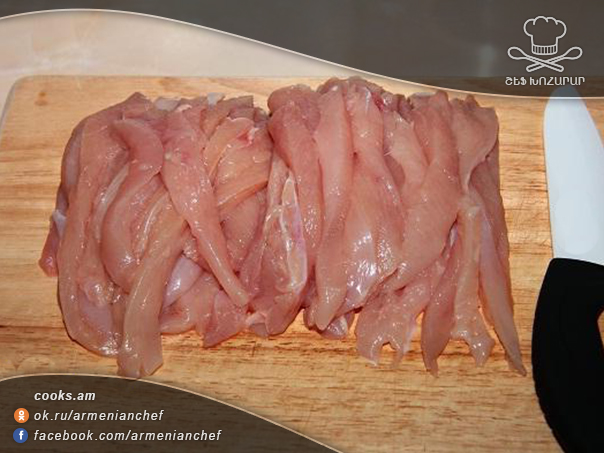 - Հավի փափկամիսը շերտերով կտրատում ենք։ Բուսայուղը, մանանեխն ու աղը խառնում ենք։ Միսը այդ խառնուրդով պատում ենք և 30 րոպե սենյակային ջերմաստիճանում ենք թողնում։