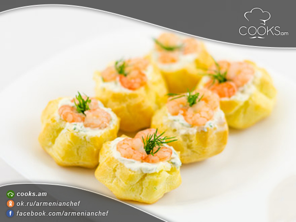 - Պատրաստում ենք երկրորդ լցոնը: Ծովախեցգետիններն լցնում ենք տաք ջրի մեջ, եռացնում 1 րոպե և ջուրը տափում: Այնուհետև կտրում ենք փոքր կտորներով, ավելացնում մասկարպոնեն, կտրատած սամիթը, ճզմած սխտորն ու լավ խառնում: Եթե զանգվածը պինդ է ստացվում, կարող ենք 1-2 գդալ թթվասեր ավելացնել: