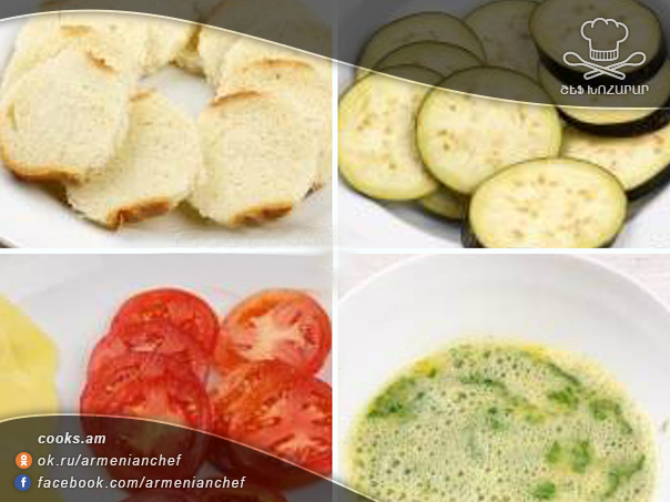 - Բատոնը շերտ-շերտ կտրատում ենք, հետո բաժակի օգնությամբ օղակներ կտրում, որոնք էլ լինելու են նախուտեստի հիմքը: Ստացվում է 10 կտոր: Սմբուկը լավ լվանում ենք, շրջանաձև բարակ կտրատում: Լոլիկը նույնպես լվանում ենք ու բարակ կտրատում: Պանրի կտորները նույնպես բաժակի օգնությամբ կլորացնում ենք: Կանաչին լավ լվանում ենք, չորացնում ու մանր կտրատում: 2 ձուն պատառաքաղով հարում ենք, ավելացնում կանաչու 2/3 մասը, մի պտղունց աղ ու սև պղպեղ: