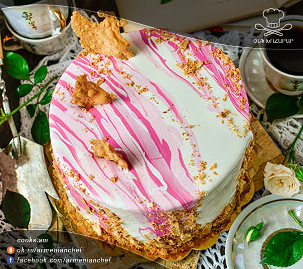 նրբագույն կրեմով ներծծված…Շերտերը պետք է լավ թխված լինեն, իսկ եփած կրեմը` նուրբ, բայց միաժամանակ թանձր ու մի փոքր կպչուն։ Եվ ցանկալի է այն ուտել նույնիսկ ոչ թե երկրորդ, այլ պատրաստելուց հետո երրորդ օրը 🙂