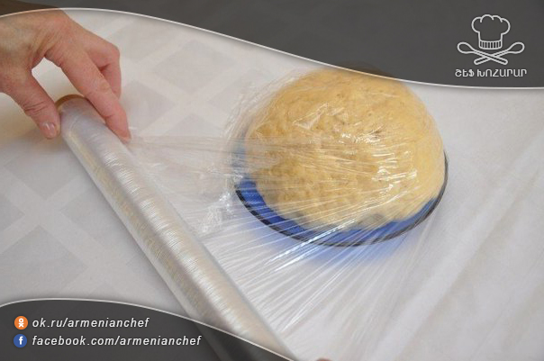 - Խմորը հանել սառնարանից, բացել գրտնակով, վրան լցնել միջուկը, փաթաթել ռուլետի նման և 30 րոպեով տեղափոխել սառնարան: